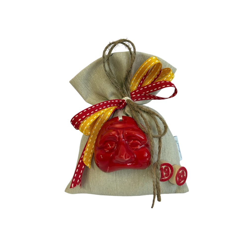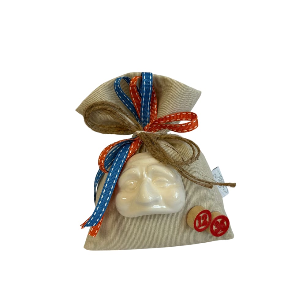 Sacchetto porta confetti in cotone naturale con maschera Pulcinella in porcellana di Capodimonte misure 12×14 cm – Bomboniera elegante per ogni occasione