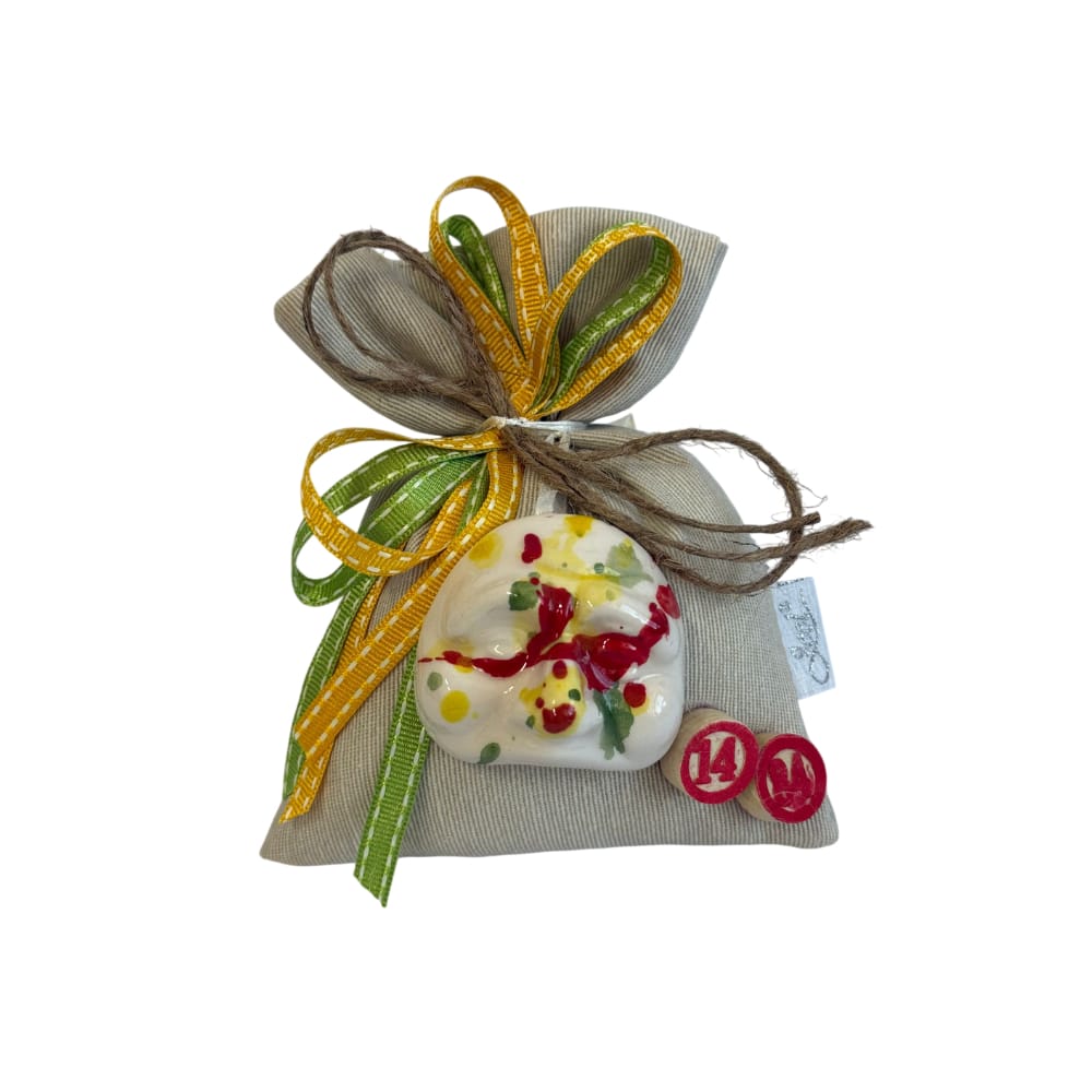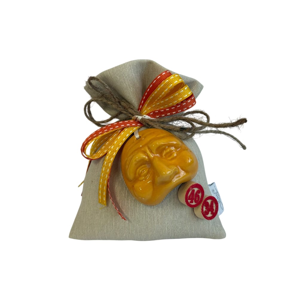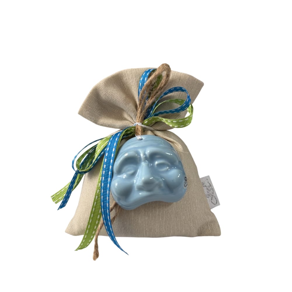 Rendi unici i tuoi eventi speciali con questo raffinato sacchetto porta confetti in cotone naturale, impreziosito da una splendida maschera di Pulcinella realizzata in pregiata porcellana di Capodimonte. Un connubio perfetto tra tradizione artigianale italiana e stile elegante, ideale per chi desidera una bomboniera originale e ricca di significato, tutto Made in Italy.